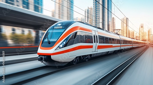 © anantachat, Naklejka premium Cartoon-style passenger train with large windows and exaggerated features moving on a smooth clean surface Large space for text in center Stock Photo with copy space