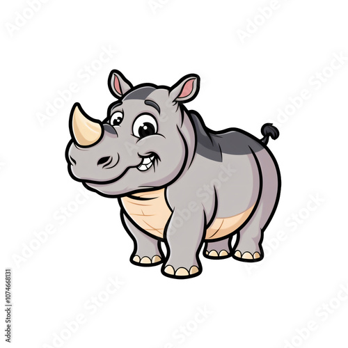 © Jitesh, Fototapeta premium Cartoon style rhinoceros sticker with big eyes, happy expression, and playful pose on white background, generative ai