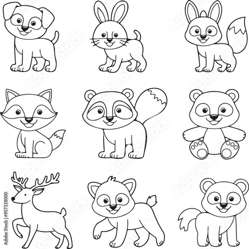 © Hafiz360, Obraz premium Cartoon style single line art Animals picture set, generative AI