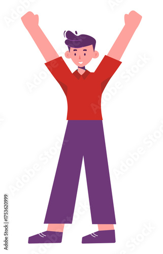 Fototapeta premium Cartoon-style young man in red shirt joyfully raising his arms, expressing...