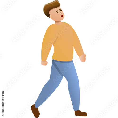 © Elsaa, Fototapeta premium Cartoon Style Young Man Wearing Orange Sweater and Blue Jeans Walking Confidently Against a White Background