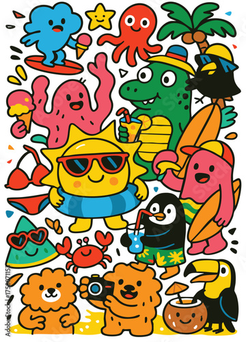 Naklejka premium Cartoon summer beach fun character, sun, animal, surfing, ice cream, tropical, happy