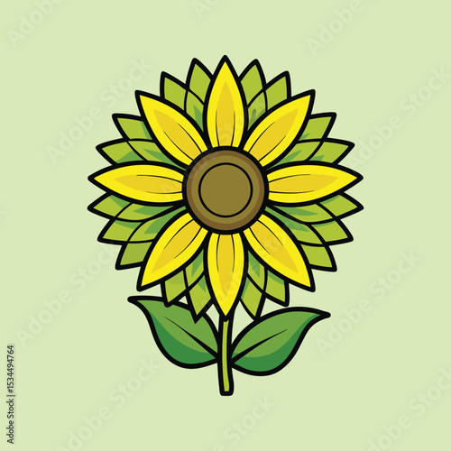 Fototapeta premium Cartoon Sunflower Illustration with Black Outlines and Green Pastel Background
