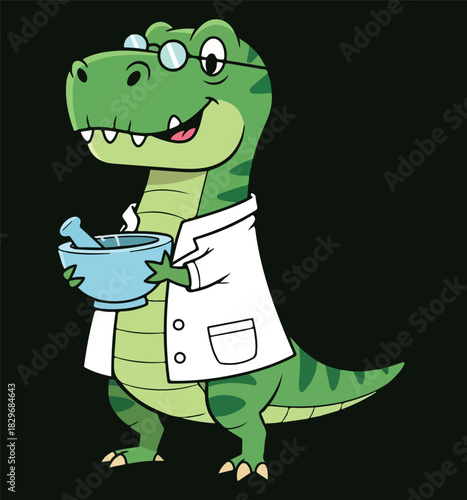 Fototapeta premium Cartoon T-Rex Pharmacist Scientist Dinosaur with Mortar and Pestle