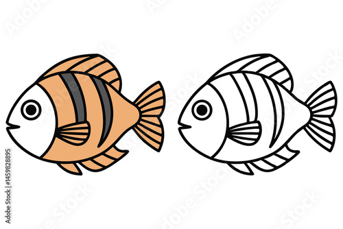 © Design_ mn, Obraz premium Cartoon tan fish with black stripes sits near its coloring book outline