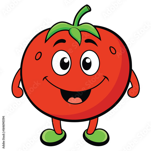 © Lovely, Fototapeta premium Cartoon Tomato Character with Big Smile and Green Stem on White Background