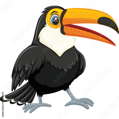 Fototapeta premium Cartoon Toucan Bird Standing Mouth Open With Large Orange Beak And Yellow Accent On White Background