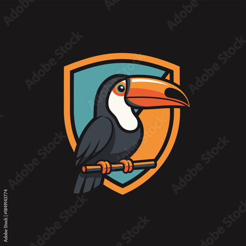 Naklejka premium Cartoon toucan bird with a large orange beak perched on a branch in front of a blue and orange shield logo on a dark background.