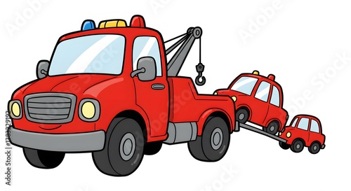 Fototapeta premium Cartoon Tow Truck Towing Two Cars Illustration on White Background