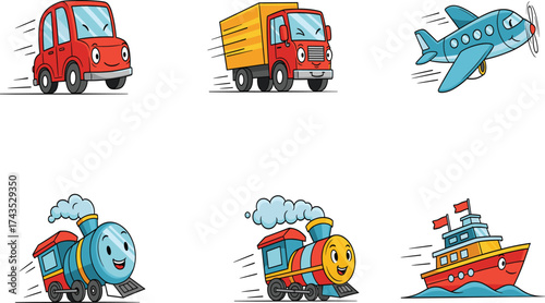 Obraz premium Cartoon transportation vehicle set with smiling car, truck, airplane, train, and boat in motion, fun and colorful kids design.