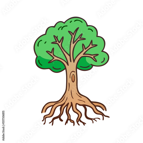 © Mariam, Obraz premium Cartoon Tree with Green Leaves and Roots on a Black Background