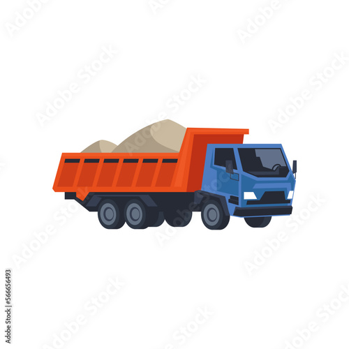Fototapeta premium Cartoon truck with sand isolated on white. Construction machines. Vector illustration of heavy machinery for building. Industry concept