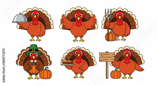 © Jamshadul, Obraz premium Cartoon turkeys in various festive activities, including cooking, farming, and celebrating, illustrated in a playful style
