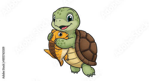© Ari, Fototapeta premium Cartoon Turtle Holding a Fish with a Happy Expression.