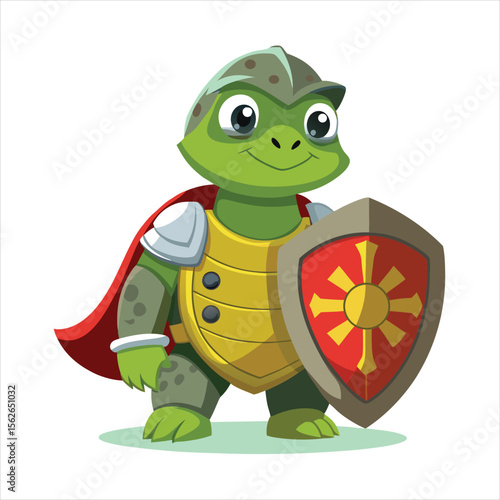 Fototapeta premium Cartoon turtle knight in armor holding a shield isolated on white background