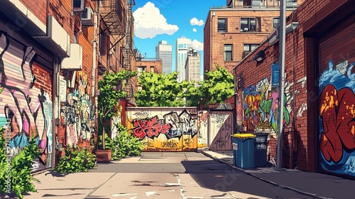 Naklejka premium Cartoon urban scenery featuring a street with graffiti-covered walls and urban art