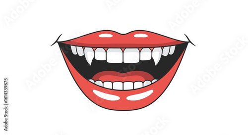 © Gigih, Naklejka premium Cartoon Vampire Mouth with Sharp Fangs and Red Lips Halloween Theme Vector Illustration Isolated on White Background