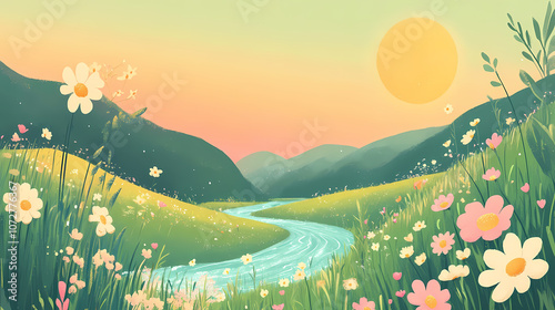 Fototapeta premium Cartoon vector a whimsical spring landscape with a flowing river, blooming flowers, and green hills. Whimsical. Illustration