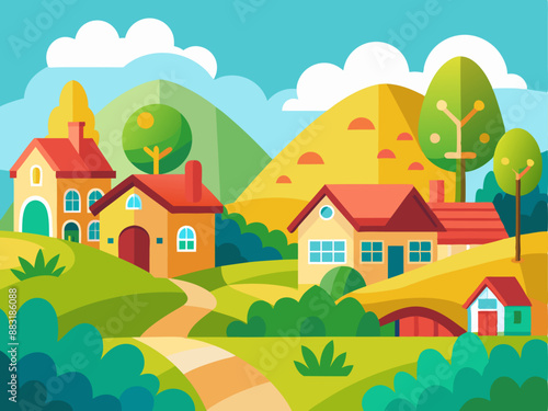 © MDMAHBUBUR, Fototapeta premium Cartoon Vector Countryside with Houses and Green Fields - Children's Book Style