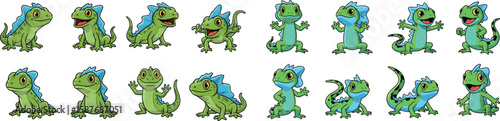 Obraz premium Cartoon vector set of green and blue frilled lizards in various poses and...