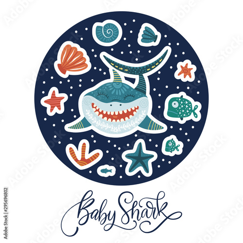 © trihubova, Fototapeta premium Cartoon Vector Shark Illustration. Baby shark cute design with sea animal fishes and hand drawn lettering quote.