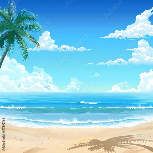 Fototapeta premium 3️⃣ cartoon vector style landscape view of the beach with palm trees, blue sky and white clouds, ocean waves crashing onto sandy shore, bright summer day