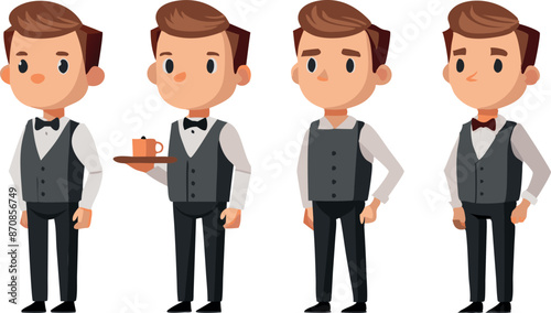 Naklejka premium Cartoon waiters in uniform with different poses including holding a tray