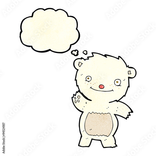 Naklejka premium cartoon waving polar bear cub with thought bubble