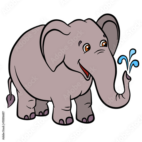 © ya_mayka, Naklejka premium Cartoon wild animals for kids. Little cute elephant lets water fountain from the trunk. He smiles.