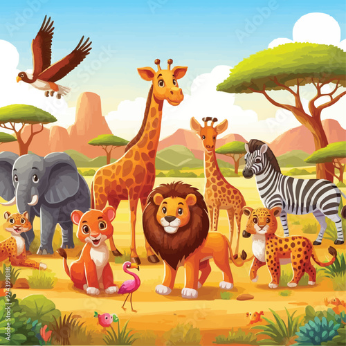 © StockerShawon, Naklejka premium Cartoon wild animals in savannah African safari wildlife. vector