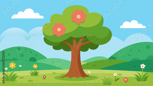 Fototapeta premium Cartoon Wildflower Meadow with Big Tree Nature Landscape Illustration