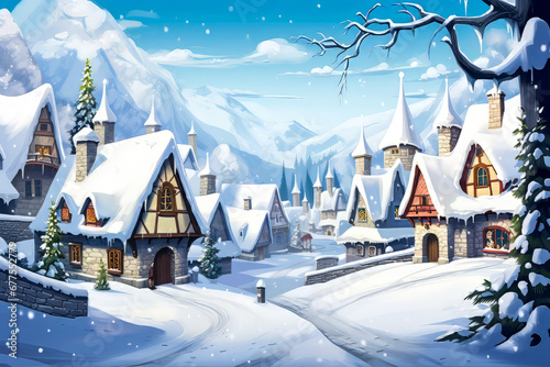 Naklejka premium Cartoon Winter Village. Generated Image. A digital illustration of a...