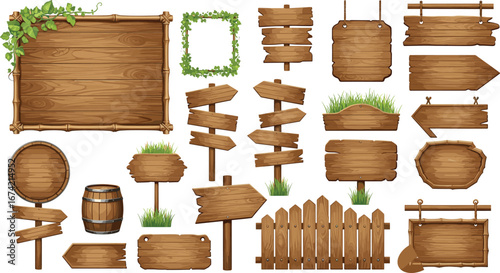 Naklejka premium Cartoon wooden signs, blank wood boards, rustic arrows, vintage planks, vector elements, isolated icons, nature frames, fence, barrel, grass