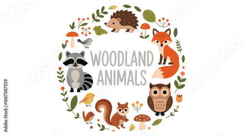 © Trendy Three, Fototapeta premium Cartoon Woodland Animals Wreath Featuring Fox, Raccoon, Squirrel, Owl, Hedgehog, and Birds on White Background