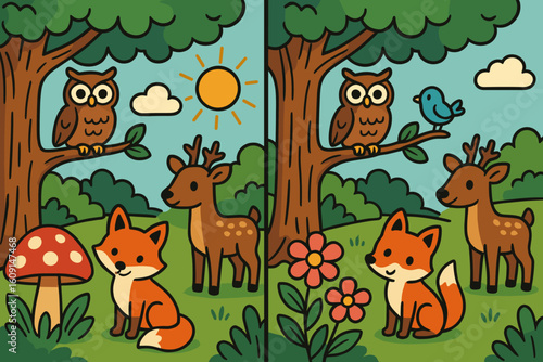 © Bay, Naklejka premium Cartoon woodland scene with animals for educational game "Find differences"