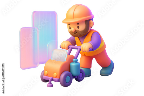 © Who is Danny, Fototapeta premium Cartoon worker in safety gear pushing a small road roller machine, colorful graphic style, isolated on white background, concept of transport. Ai generative