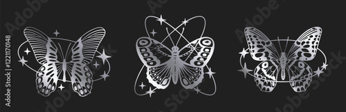 © GreenSkyStudio, Obraz premium Cartoon y2k butterfly. Abstract silver y2k aesthetic flying insect, shiny foil butterfly silhouettes flat vector illustration. Butterfly decor