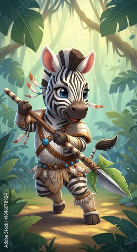 © Ariestia, Naklejka premium Cartoon zebra warrior character stands ready with a spear in a lush jungle environment