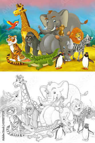Fototapeta premium Cartoon zoo scene with sketch in the jungle stage with animals illustration