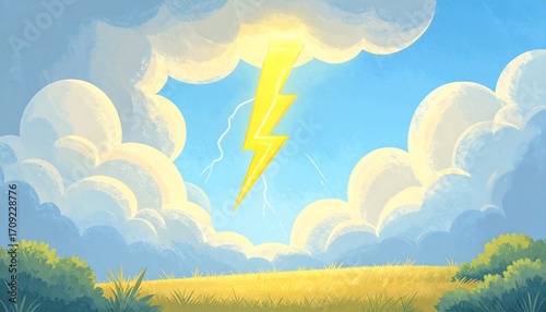 Obraz premium Cartoonish clouds, lightning, field