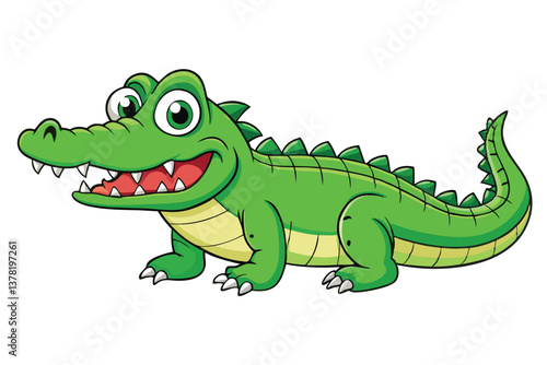 Naklejka premium Cartoonish Green Crocodile Smiling with Sharp Teeth on White Background