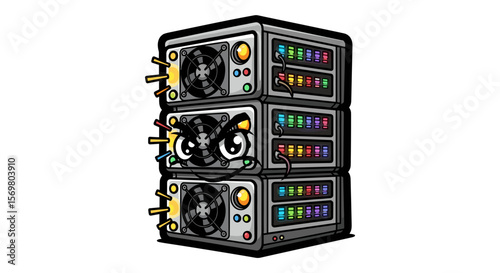 © Luan, Obraz premium Cartoonish server stack with three units and an angry face in the middle unit with colorful lights