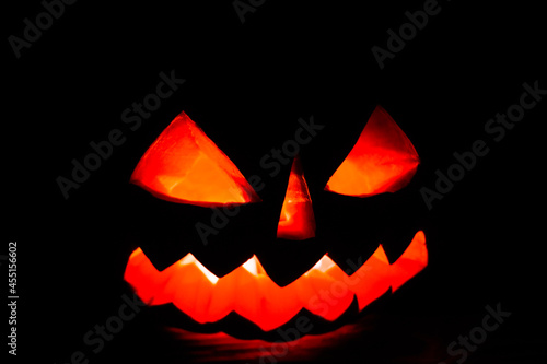 Fototapeta premium Carved halloween pumpkin jack-o-lantern glows in a darkness