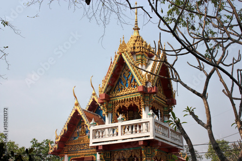 Fototapeta premium Carved multi-colored wooden building in Thailand