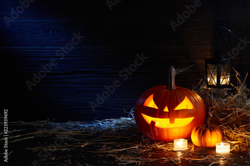 Fototapeta premium Carved pumpkin or jack-o-lantern in dark barn, Halloween holiday celebration...