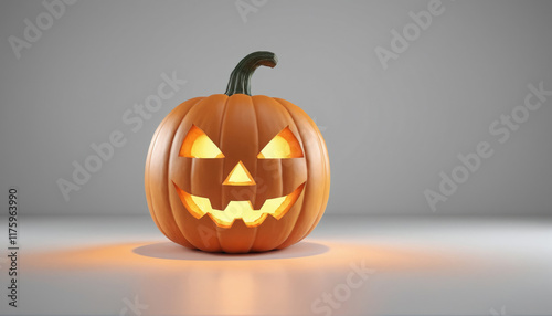 Fototapeta premium Carved pumpkin with glowing eyes and mouth displayed in a dimly lit environment for Halloween celebration