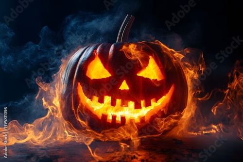 © ngalong project, Fototapeta premium Carved pumpkin with glowing face surrounded by flames against a dark background.