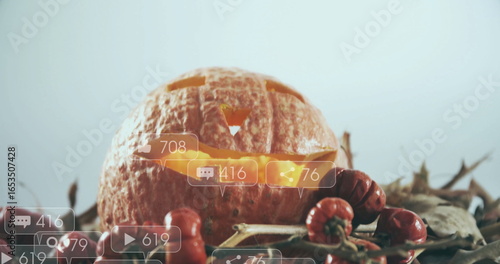 Fototapeta premium Carved pumpkin with social media notifications image over autumn decorations