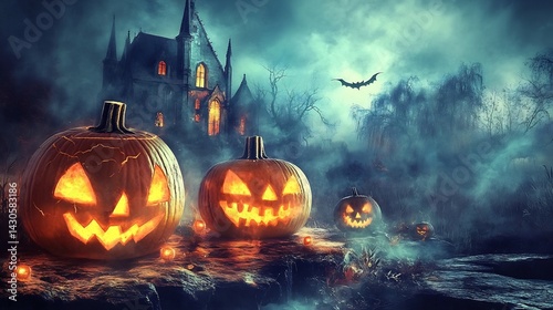 Fototapeta premium Carved Pumpkins Glow Eerily Before a Gothic Mansion in a Spooky Halloween Scene