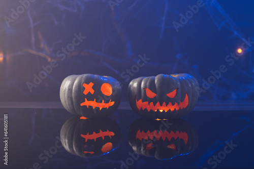 Fototapeta premium Carved pumpkins with copy space on blue background